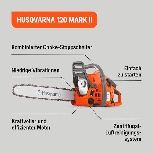 Husqvarna 120 Mark II Benzin-Kettensäge mit 38,2 cc X-Torq Motor und 14 Zoll Schiene für Gartenarbeiten und Brennholz