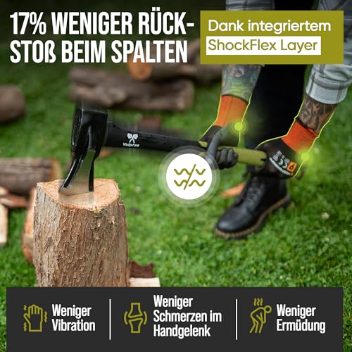 Ein integrierter ShockFlex-Layer im Griff der VULPAXE Spaltaxt reduziert Vibrationen und sorgt für einen sicheren Halt während des Gebrauchs. Dies minimiert das Risiko von Verletzungen und erhöht den Komfort bei der Arbeit. Die Axt ist für Nutzer geeignet, die Wert auf Sicherheit und Ergonomie legen, insbesondere bei wiederholten Anwendungen.